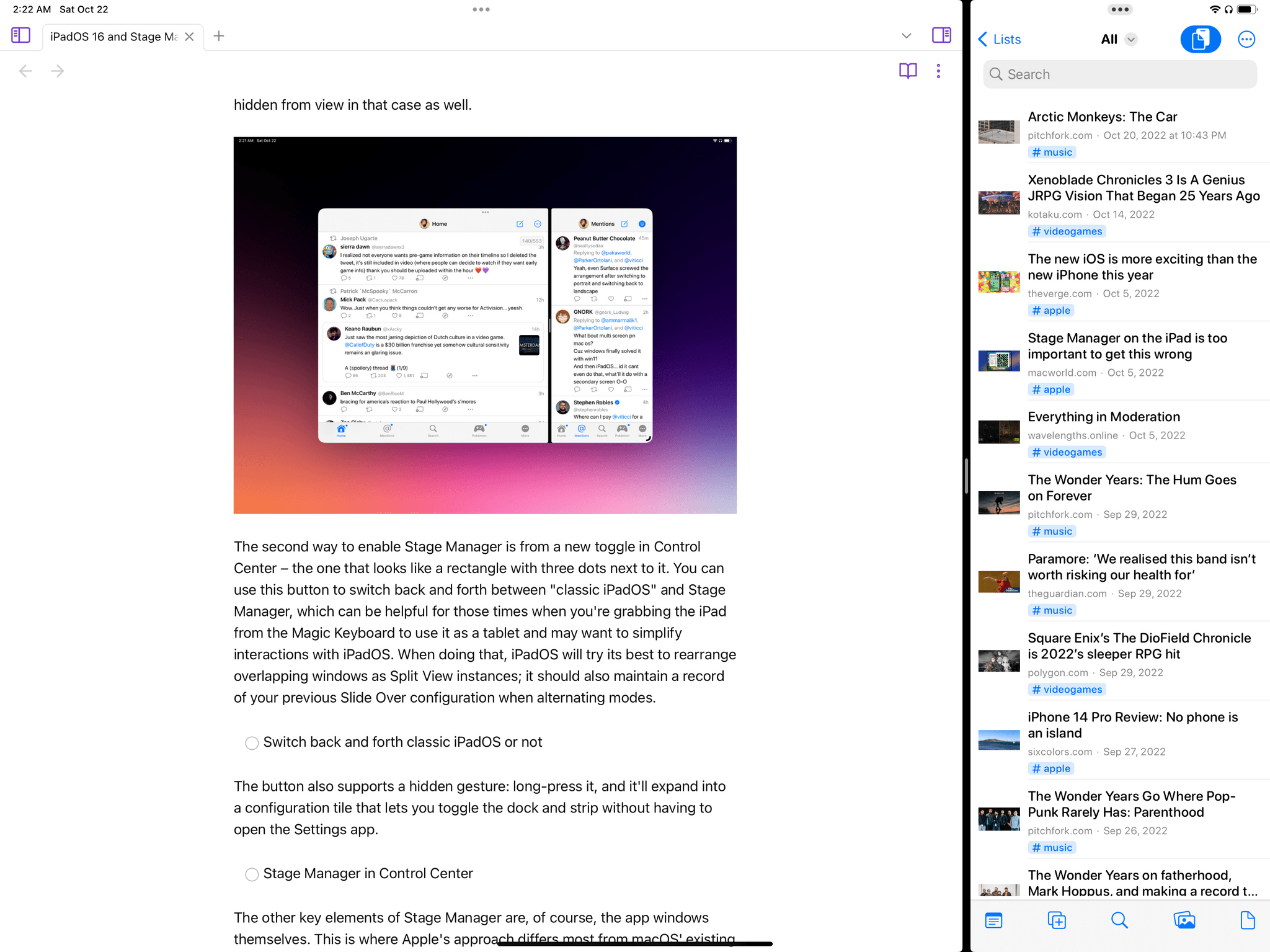 In the short term, Apple will probably justify the issues of Stage Manager by saying that it’s a specific mode for a small subset of users, that it’s disabled by default, and that they’re working on it. All those things are true. But I also have the feeling that Apple underestimated how hungry iPad users were for a new take on multitasking on their $1200 portable computers that would finally take advantage of the iPad’s powerful hardware.